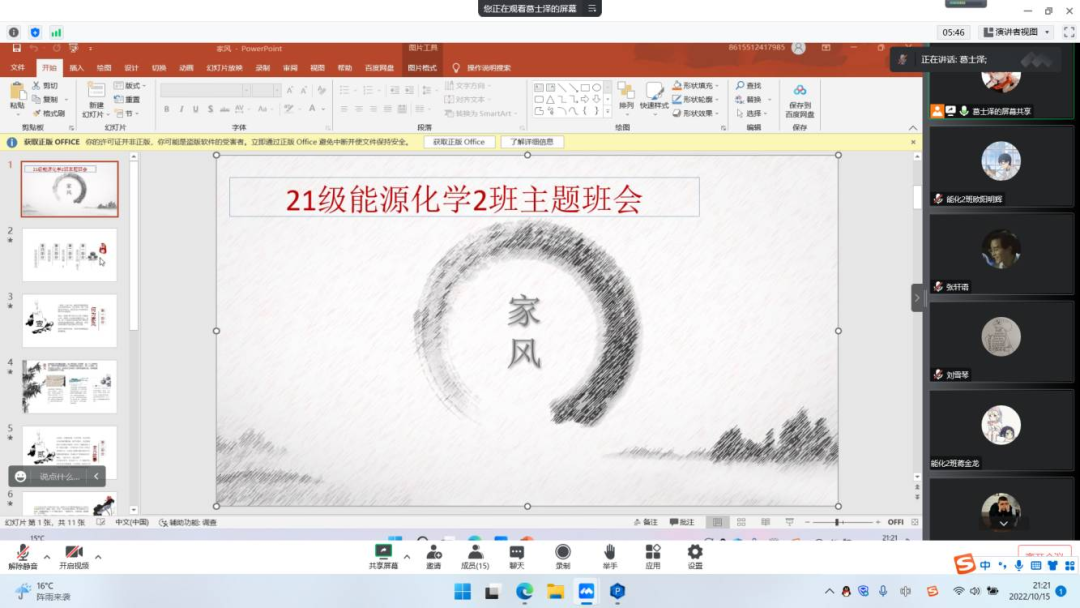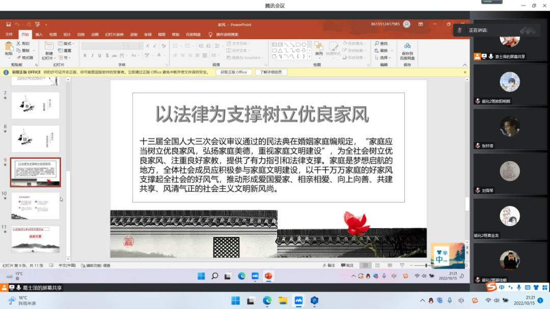 本次活动从知识竞赛、主题班会、征文比赛、家风传承四个方面展开,旨在弘扬家风文化,加强家风建设,让学生们更好的认识了解家风、传承中华家风文化。通过鼓励学生积极参加学习通平台的线上知识竞赛,回答家风相关问题,唤起同学们学习家风的兴趣。此次活动以班级为单位开展主题班会,学委和班长通过科普讲解的形式,帮助同学们了解认识中华文明几千年以来的优秀家风文化。