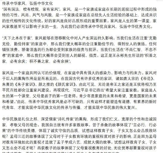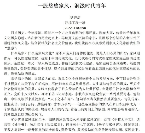 举办征文比赛,鼓励同学们分享对家风文化的感悟,从而更好的传承优秀的家风文化。活动共收到征文100余份,从中评选出了一等奖3名,二等奖5名,三等奖7名,优秀奖若干。同学们的征文反映了各自对优秀中华家风的所思所想和收获。