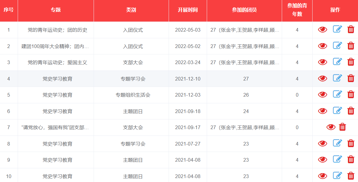 规范三会两制一课,每学期定时召开支部团员大会、支部委员会、组织团课学习、青年大学习网上主题团课学习完成率始终100%。加强智慧团建应用,定期对“智慧团建”系统各类信息的补充完善,将所有的“党史学习教育”、“三会两制一课”应录尽录。