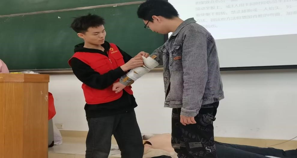 其次,志愿者讲解了骨折的紧急处理救护的正确方法,同时也纠正了一些急救误区。并让同学们亲身示范如何正确包扎,掌握了外伤急救的正确操作,详细了解了常见应急情况的处置步骤,有效地提高了应对紧急情况的能力。