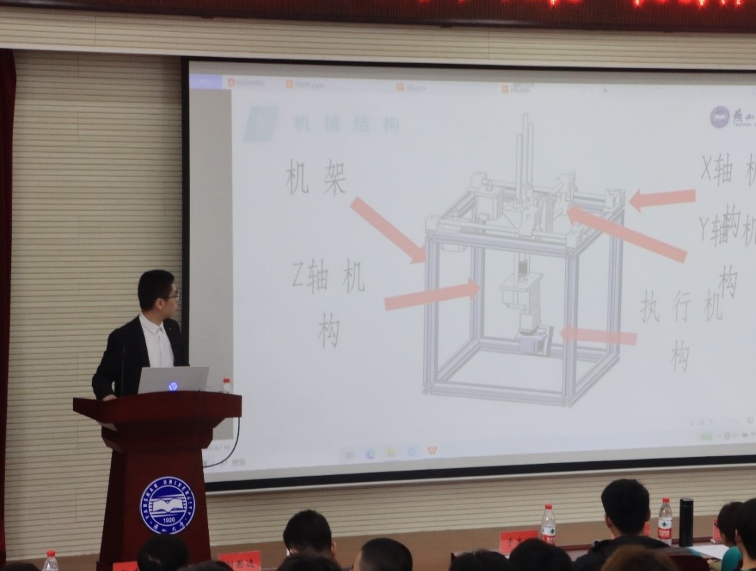 在宣讲环节,武利亚讲述了艾默生的企业发展及文化,杨勇围绕企业价值观及技术路线和要求进行了相关介绍。杨东峰在总结发言中介绍了学院双创教育的发展历程和特色及近年来取得的成果,鼓励各位同学积极参加双创竞赛,提升创新思维和能力以及科学精神,并希望与艾默生公司在人才培养方面有更深入的合作。
