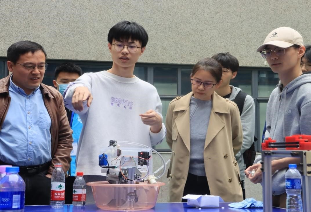 各参赛组组长首先在机械馆天井向评委及嘉宾进行实物演示并做简要介绍,随后的答辩环节中,各组通过PPT形式多维度阐释了作品,嘉宾及评委对各组作品进行现场点评并提出建议,同时完成现场打分。
