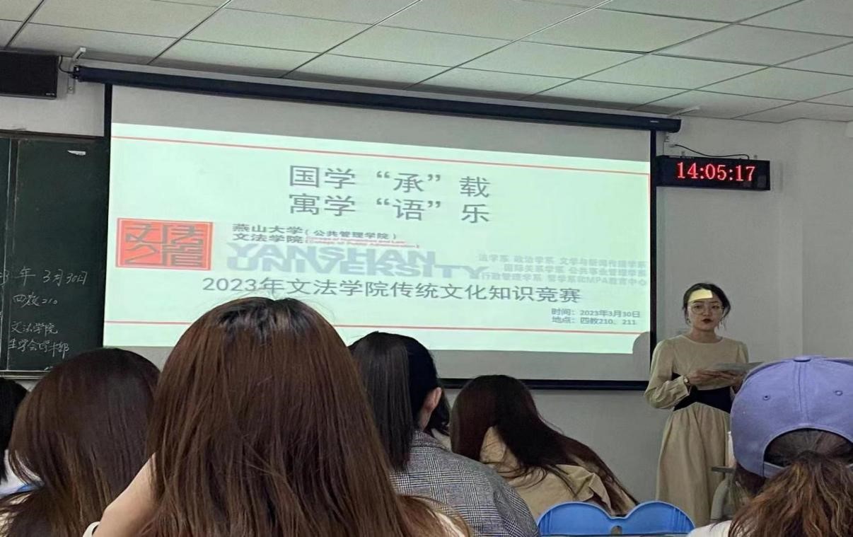 为学习践行党的二十大精神,传承中华优秀传统文化,激发同学们对传统文化的兴趣,4月3日,文法学院(公共管理学院)于东校区第四教学楼210、211室举办了“国学‘承’载,寓学‘语’乐”中华优秀传统文化知识竞赛。本次活动由学院团委主办,学院研究生会承办。