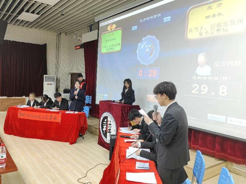 车辆工程卓越二班的同学也不甘示弱,一辩刘翔开篇立论,气势如雷,指出泛娱乐化是符合时代的必然产物,有利于社会的发展进步。二辩辛上日和三遍杜逸铭,强强联合,据理力争,以守为攻,毫不退让,在对辩环节大杀四方,针对敌方漏洞一针见血。四辩种梓尧结辩点题,收集敌方矛盾并加以点破,综合己方优势论据,进一步巩固胜利,最后说明泛娱乐化满足人们需求,促进经济发展,明确泛娱乐化不是弊病的观点。
