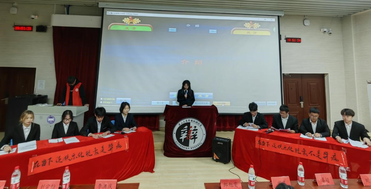 决赛时刻,由能源动力类22-5班组成的正方队伍和由车辆工程卓越计划22-2班组成的反方队伍就“在当下,泛娱乐化现象是否为弊病”展开激烈讨论。比赛开始,能源动力类22-5班吹响号角,一辩纪梦晴条理清晰,凌厉打出泛娱乐化现象造成了错误的价值观,指出泛娱乐化是弊病的观点。二辩李雨乔和三辩申文静主动出击,抽丝剥茧,抓住对方弱点毫不放松,毫不退让。四辩于金靖结辩点题,对准漏洞逐个击破,最后再次重申泛娱乐化遮蔽了对重大问题的深入探究与思考,导致公众逐渐失去对事物的思考是一种错误的价值观。真正地展现出了辩论该有的魅力与风采。