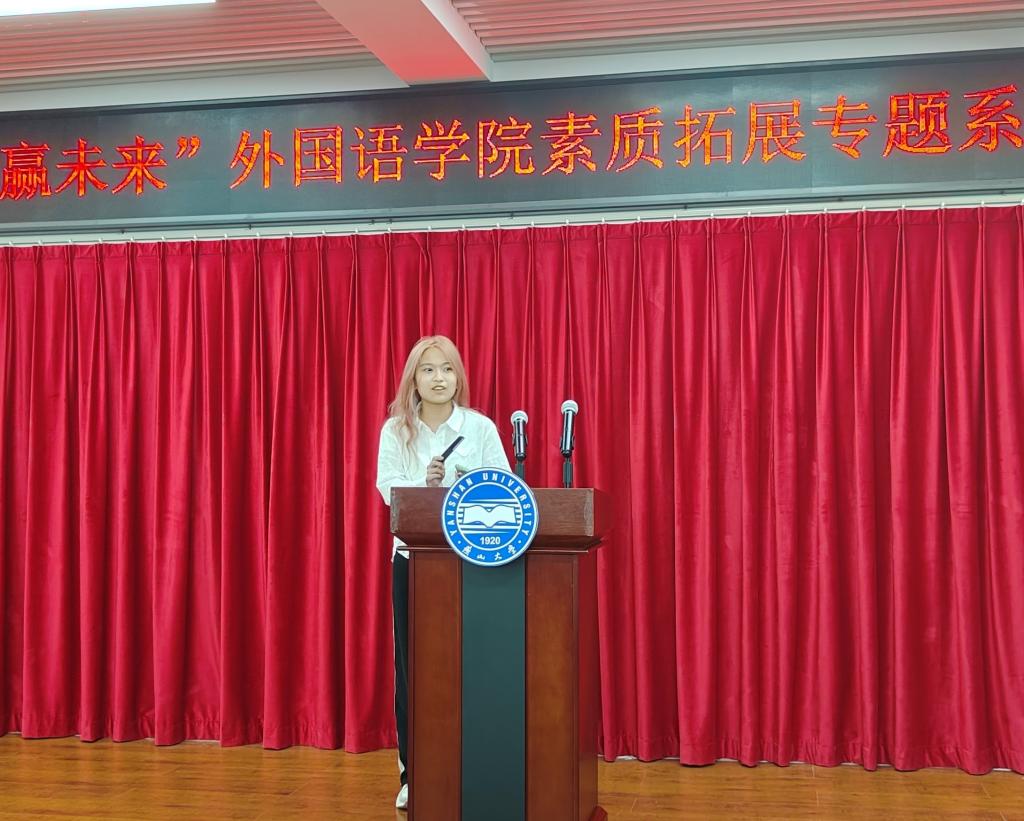 国家奖学金获得者、日语专业乔柏霖同学介绍了自己自入学以来参加竞赛的成绩以及经验,并提出良好的团队精神和积极进取的人生态度,是当代大学生应有的基本素质,也是个人人格特质的两大核心内涵。“挑战杯”省二等奖获得者党嘉欣同学列举出诸多身边成功案例,表示通过参加各种各样的竞赛可发掘自身的兴趣爱好、拓展视野、丰富大学经历。同时,以自身的参赛情况,向同学们传授了参加各类学科赛事的经验和经历,进而引导同学提以更大的兴趣和激情积极参加各类学科赛事。