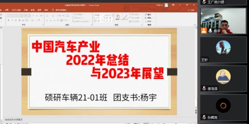 硕研(车辆)21-01班团支书杨宇同志,带领大家学习由中国汽车工业信息网发布的《中国汽车产业2022年总结与2023年展望》,引导班级成员树立正确的择业观、就业观,让青春闪耀在祖国和人民最需要的地方。