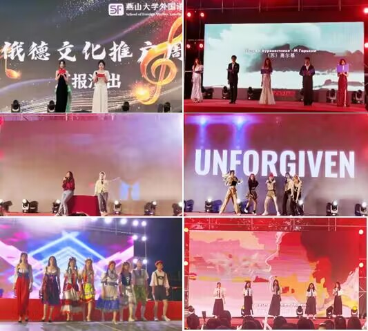5月28日,在东校区灯光球场举行了文化周闭幕式及汇报演出。演出节目精彩纷呈,德语、俄语专业学生以语言技能为基础带来了舞蹈、独唱、合唱、朗诵、趣味互动等13个表演节目。一首动听悦耳的俄语歌曲《Команда》拉开演出的序幕,德语歌曲小合唱《Für die Liebe》饱含深情。节目精彩纷呈,非凡闪耀,给师生们带了一场异域国别的视听盛宴,《俄德服装秀》将现场气氛推向了高潮,青春活力,活泼可爱,展示异域风情的同时也展示了学生们的青春风采。