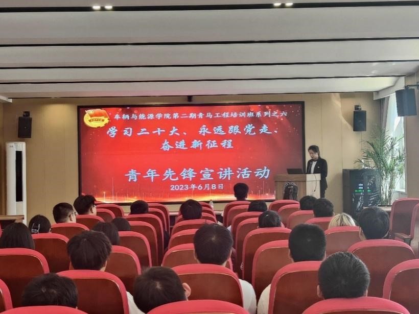 2023年6月8日15:00,车辆与能源学院在车辆馆317开展第二期“青马工程”培训班系列之六——“学习二十大,永远跟党走,奋进新征程”青年先锋宣讲活动,出席本次活动的嘉宾有学院团委书记杨春婧、校团委青年先锋宣讲团负责人韩金璐,马克思主义学院马新萌同学、信息科学与工程学院张云巍同学、经济管理学院王明皓同学担任主讲,会议由靳佳阳同学主持,第二期“青马工程”培训班全体学员参加了本次活动。