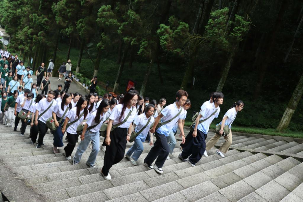 山峦含黛,素花点缀的陵园显得庄重而肃穆,映入眼帘的是“井冈山烈士陵园”七个烫金大字。成员们在讲解员的带领下排成纵队,庄严肃立,在默哀致敬中深切缅怀先烈,寄托哀思。经过花坛园庭,顺山而上的宽阔台阶分为两组,第一组49级,象征1949年新中国成立。第二组60级,象征着陵园建成是在井冈山革命根据地创建六十周年的1987年。成员们一步步走上台阶,踏入这片浸满先辈们鲜血的土地,深刻感受着这里所承载的无比厚重的历史意义和精神力量。