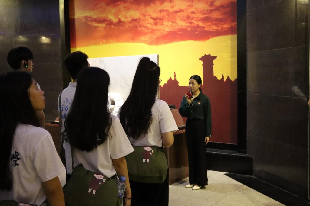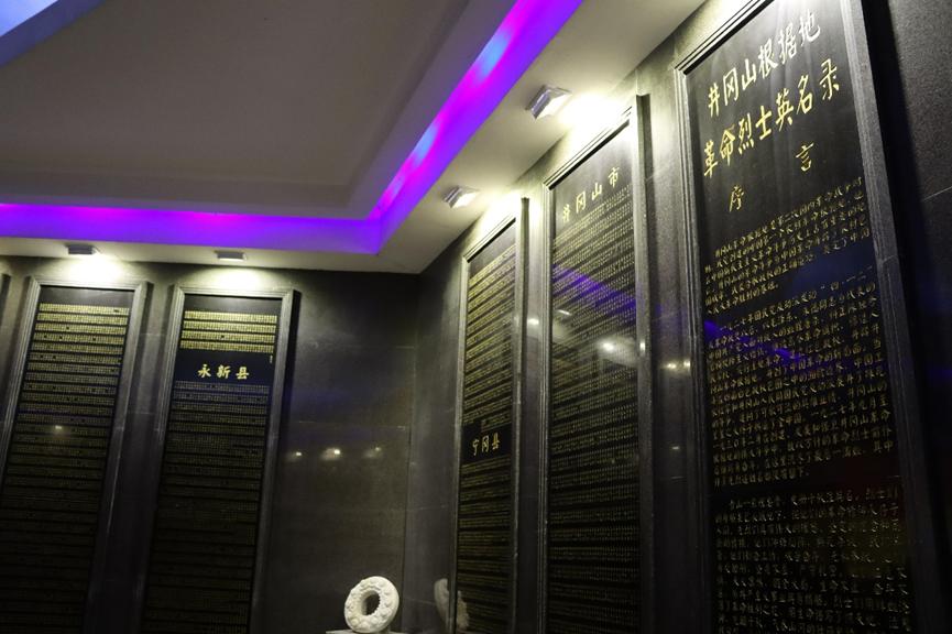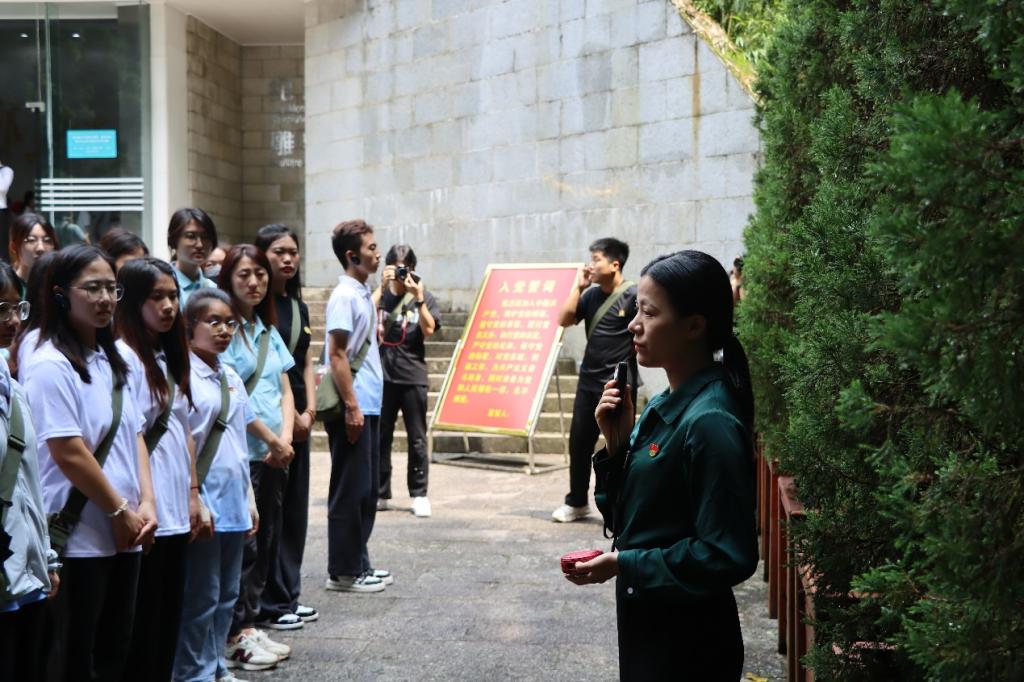 进入瞻仰大厅,汉白玉墙上嵌刻着毛泽东在1946年为革命烈士们题写的“死难烈士万岁”六个大字。吊唁大厅的四周由黑色大理石铺制而成,上面是在井冈山斗争时期壮烈牺牲的烈士英名录,一排排烈士姓名的背后,都镌刻着两个字—青春。在井冈山斗争两年零四个月的时间里,共余4.8万名英烈牺牲,革命先辈们背后的故事令人潸然泪下,他们是父母的孩子,或许是一位父亲、一位母亲,或是一位丈夫、一位妻子,他们有着不同的身份,却始终拥有着相同的信仰——为共产主义事业奋斗终身。随后,成员们怀着崇敬的心情,一同重温入团誓词。一声声响亮的宣言,一双双坚定的眼睛,彰显着青年感怀先辈们积极投身于民族复兴,同时也要接过历史与人民赋予的重担。