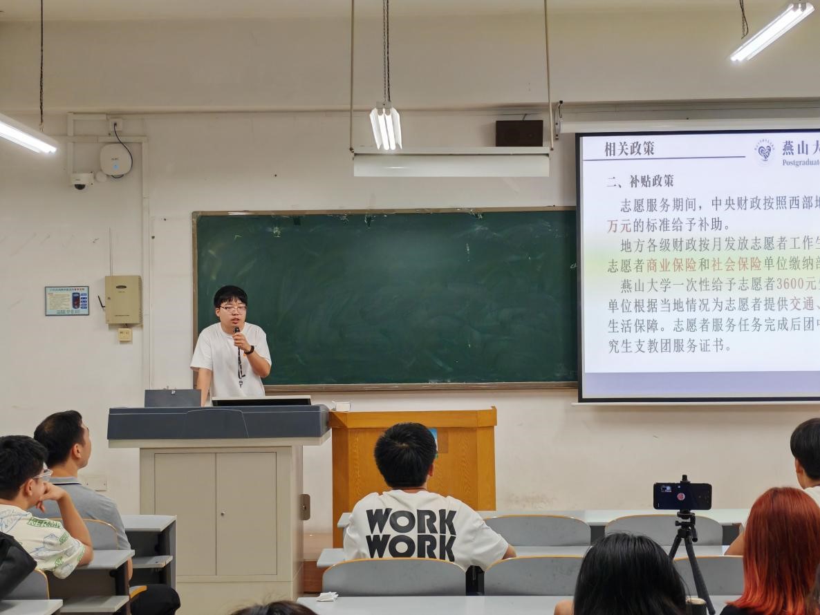李泳波同学首先向大家简要介绍了研究生支教团的基本情况,以支教的公益志愿实质开讲,对项目背景、政策保障、招募条件、招募流程等进行了详细介绍,鼓励同学们积极参与,投身西部志愿服务。
