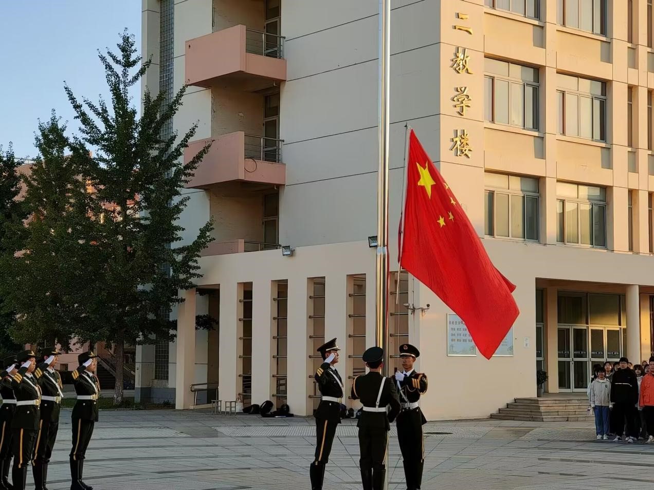 升旗仪式由张瀚同学主持。伴随着中华人民共和国国歌的奏响,五星红旗冉冉升起,在阳光下迎风飘扬。心中所向皆为华夏山河,全体师生肃立,向着国旗行注目礼,齐声高唱中华人民共和国国歌。