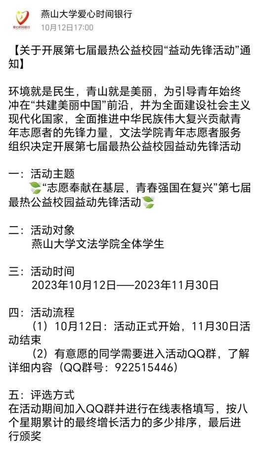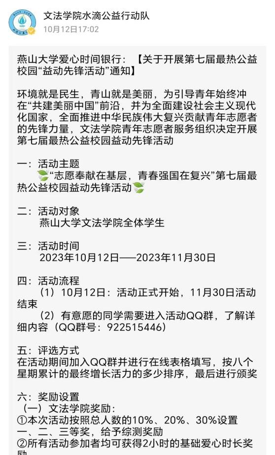 为深入学习贯彻党的二十大精神和习近平总书记关于青年工作的重要思想,积极引导广大青年志愿者投身基层建设,培养大学生奉献精神和担当意识,更好地为祖国建设贡献青春力量,2023年10月12日至12月3日,文法学院水滴公益行动队和爱心时间银行组织开展了第七届“最热公益校园”益动先锋主题活动。