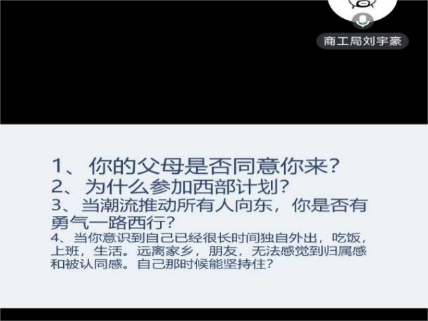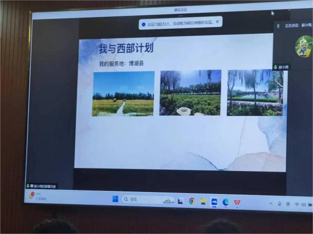 会议伊始,郭凯宇学长围绕西部计划政策福利、志愿者待遇、如何报名等模块进行讲解,帮助参会同学更多了解大学生西部计划志愿服务的相关内容。随后,学院参与西部计划的优秀志愿者郝小雨、刘宇豪同学进行线上经验分享,主要围绕服务地区介绍、工作日常、福利待遇、利弊分析等方面介绍了他们与西部计划的故事。志愿者们用他们的切身体验和真实感悟为想要投身西部计划的毕业生答疑解惑,正如志愿者郝小雨同学所说“用一年不长的时间,做一件终身难忘的事,到西部去,到基层去,到祖国最需要的地方去”,激发了大家投身西部建设的热情和信心。