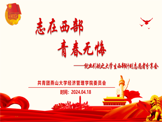 在青春的征途上,同学们怀揣着理想与热情,响应着“到西部去、到基层去、到祖国和人民需要的地方去”的号召。为进一步推动大学生西部计划宣传工作,引导更多毕业生积极投身祖国和人民更需要的地方去建功立业,4月18日19:30,经济管理学院团委以“志在西部,青春无悔”为主题,在西五A215线上线下相结合的方式举办大学生西部计划志愿者分享会。本次分享会邀请学院团委书记李宁、毕业班辅导员唱思迪、吉康,曾经参与校研支团成员郭凯宇、学院团委学生兼职副书记霍文腾以及2024届毕业生参加,会议由李宁主持。