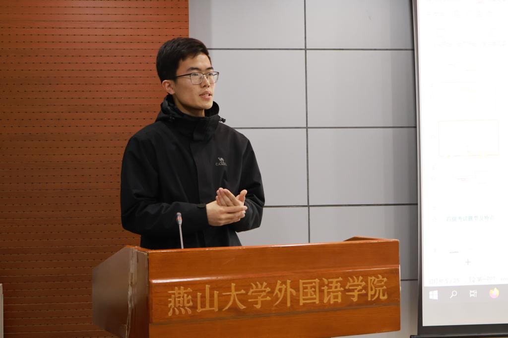 在培训过程中,同学们以条理分明、层层递进的方式,在考情解读、策略讲解和真题分析方面进行详尽的内容展示。在听力方面,马师聪同学从大纲解读入手,提倡制定有效的答题策略如视听一致和预判策略,呼吁同学们注重平时对话题和词汇的积累,在平时学习中要精听原文;谈洋同学以真题讲解开篇,协助同学们深入研讨解题策略。在阅读方面,刘灿同学简要回顾了PPT的主要内容,指出四六级阅读主要区别于词汇量的不同;高盼盼同学从解题流程至例题分析,展现出了清晰的讲解思路,使同学们得以轻松把握解题要领。在翻译方面,付齐寒同学指出六级翻译与四级翻译评分一致,随后她从词到句为同学们讲解往年真题;吴嘉玮同学先以真题为例深入讲解,再剖析解题思路,最后提出了高效的翻译技巧。在写作方面,陈梦琪同学区分了不同的题型和写作任务,建议同学们在平时多积累一些功能句以适用多个备考角度。