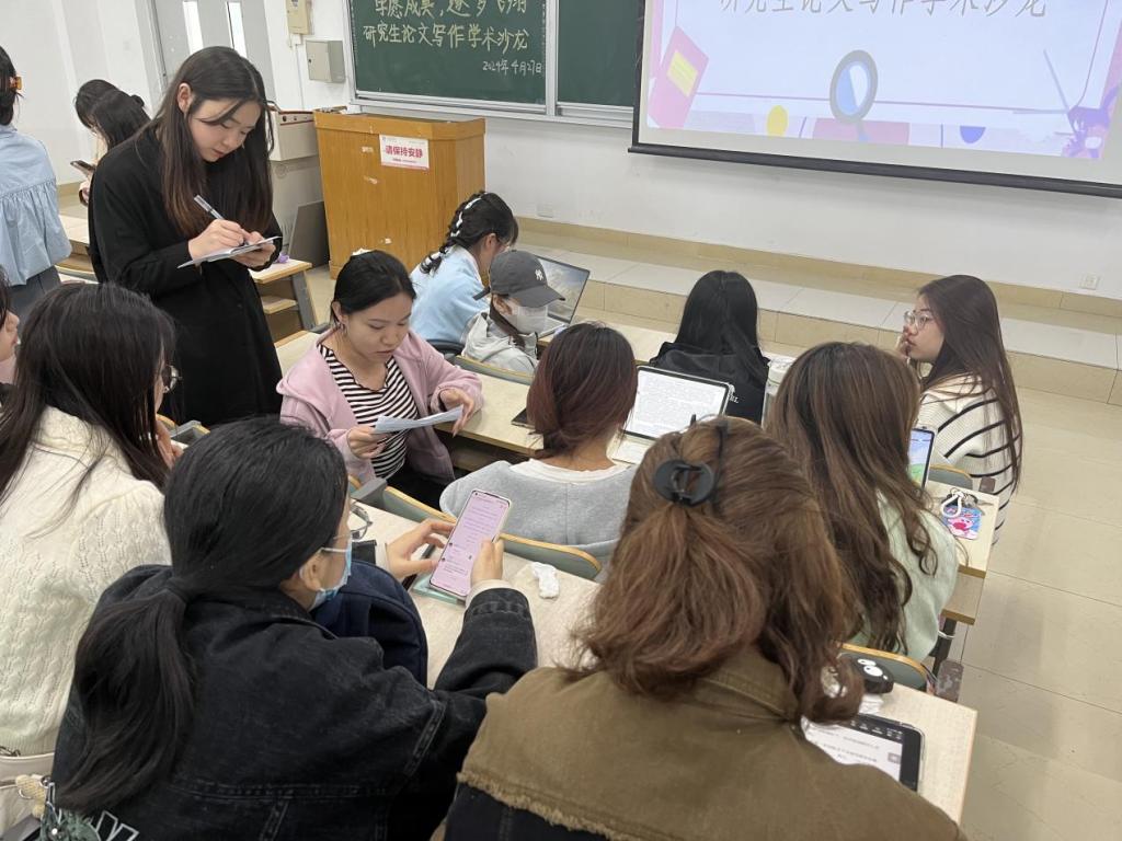 学术沙龙以圆桌会议的形式,将参会人员分为若干小组,进行分享与讨论两个阶段。各位研究生面对面交流,共同探索学术未知领域,以各自专业为切入点,积极交流与分享关于论文选题、写作、发表的相关经验,相互探讨论文写作技巧和辅助工具。分享过程中,同学们畅所欲言,讲述自己的写作经验和科研心得,介绍了CiteSpace、Nvivo等软件辅助论文写作的技巧,分享了通过知网研学等APP阅读文献的有效方法,详细讲解了学术论文从构思到成型的全过程等内容。讨论过程中有小组成员针对分享的内容,提出自己当前科研过程中遇到的难题,并对如何选择合适的学术期刊投稿、如何积累论文素材等问题进行了热烈讨论,组内积极献言,帮助彼此解决科研问题,营造了知识共享的良好学术氛围。