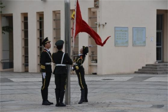 6时40分,国旗护卫队队员迈着整齐划一的步伐持着国旗走向升旗台,全体师生面向国旗庄严肃立,伴随着庄严的国歌,五星红旗冉冉升起,迎风飘扬,在每个人心中刻下深深的烙印。