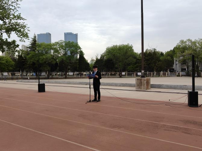 升旗仪式结束后,机械工程学院应梦涛同学就“新时代青年的责任与担当”分享了自己的感悟。他说到:“新时代赋予了青年新的使命和责任,我们要有强烈的社会责任感,传承和发扬爱国主义精神,以实际行动挺膺担当,砥砺前行,书写属于我们这一代人的辉煌篇章”。