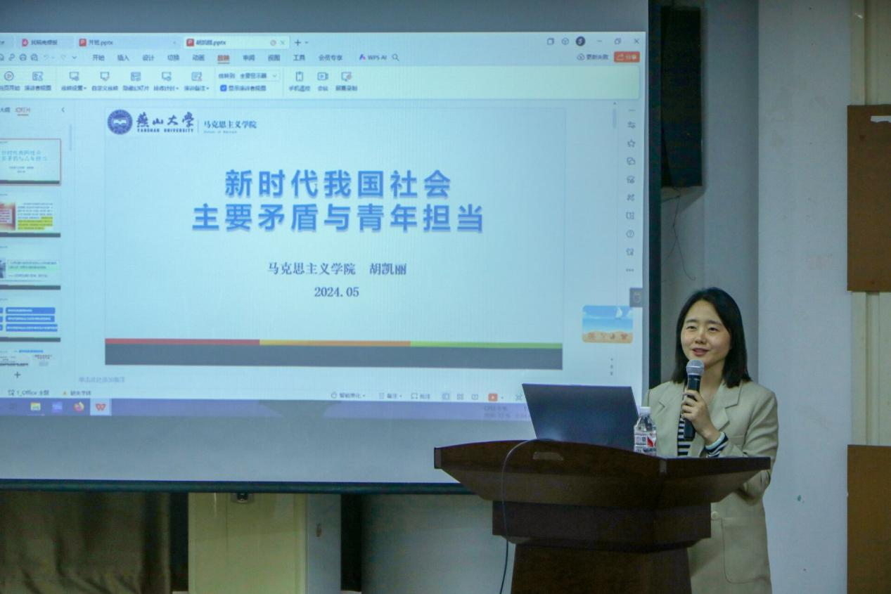 胡凯丽老师以“新时代我国社会主要矛盾与青年担当”为主题,从“新时代是怎样的时代”“新时代我国社会主要矛盾的历史转化”“新时代我国社会主要矛盾转化中的青年担当”三个方面展开细致讲解,着重分析了“主要矛盾的历史转化”,强调广大青年应是有理想的新时代青年、有本领的新时代青年、有担当的新时代青年。勉励新时代青年要有理想、有本领、有担当,只有用奋斗创造出的美好生活才是幸福的,奋斗的青春最美丽,奋斗的青春才无悔。