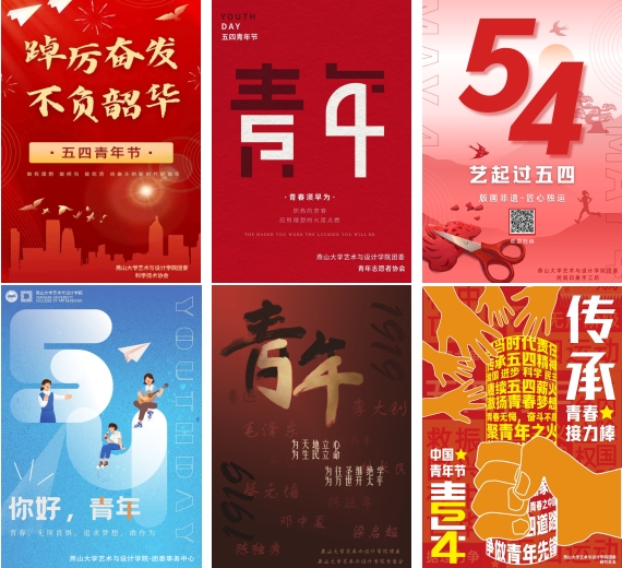5月4日——5月10日开展“五四青年节”海报设计展示活动,通过设计以弘扬五四精神为主题的海报,创新形式学习宣传发扬五四精神,激发爱国热情。