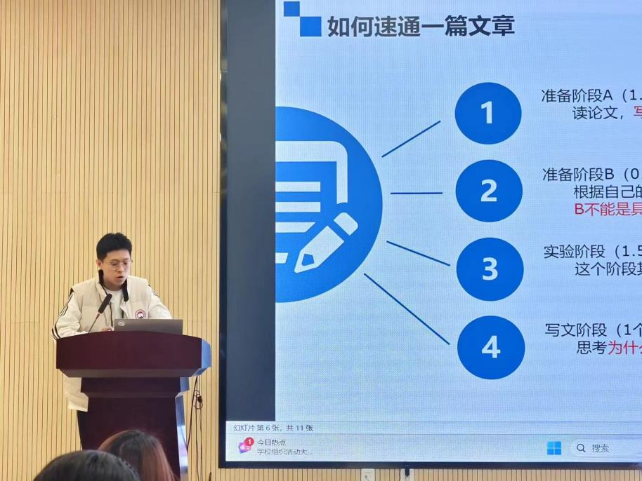 李响从自身的科研实践经验出发,详细地向同学们介绍了科技论文写作的完整流程。他从准备阶段,到构思,再到论文撰写都做了详细的说明,毫无保留的把写作经验和技巧,关键环节和注意点等向同学们进行了详细阐述。