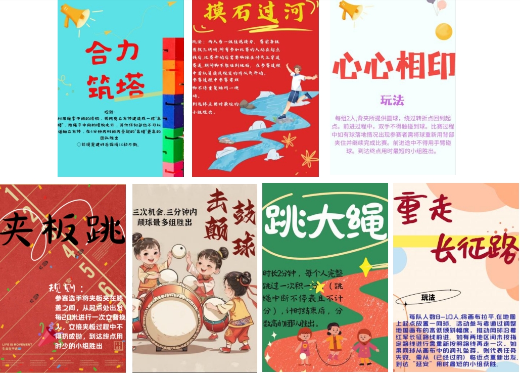 本次阳光体育运动会设合力筑塔、摸石过河、心心相印、夹板跳、击鼓颠球、跳大绳、重走长征路等七个趣味项目,各个项目主题突出,内容丰富,多元融合,创意十足,充分做到了以体育“人”,以体育“心”。