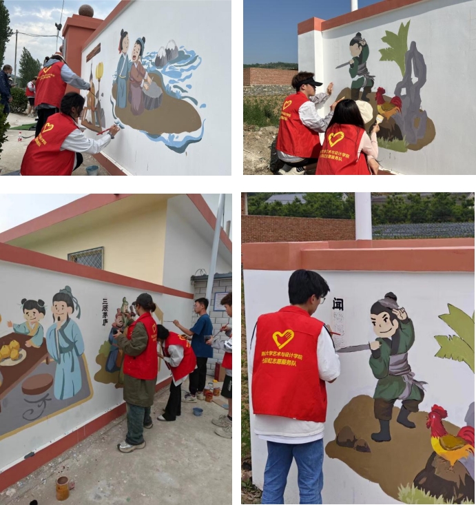 在创作过程中,志愿服务队将专业知识同多彩墙绘赋能乡村振兴、美育教育结合起来,贴近乡村儿童所需实际,尝试以手绘漫画的形式呈现传统成语蕴含的优秀品质,通过潜移默化的方式引导青少年践行社会主义核心价值观,推动艺术赋能乡村教育建设与发展。