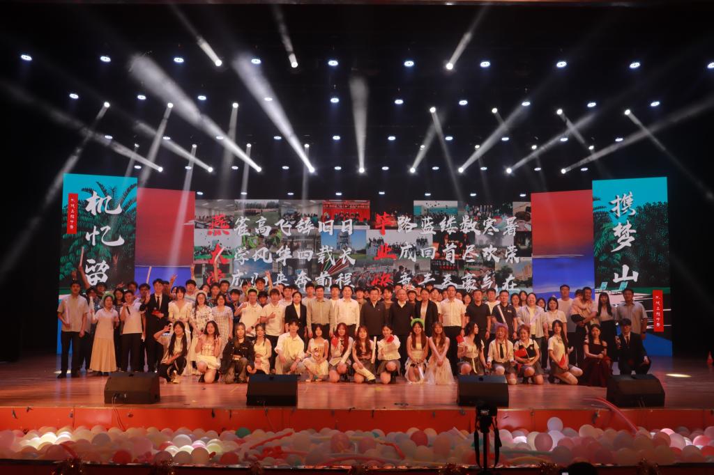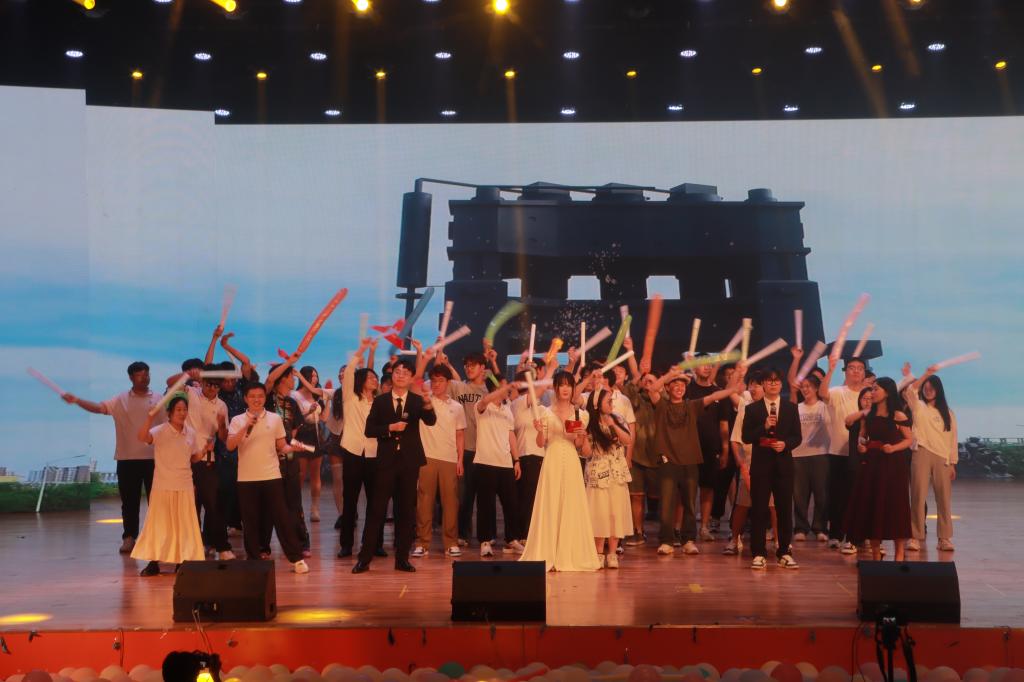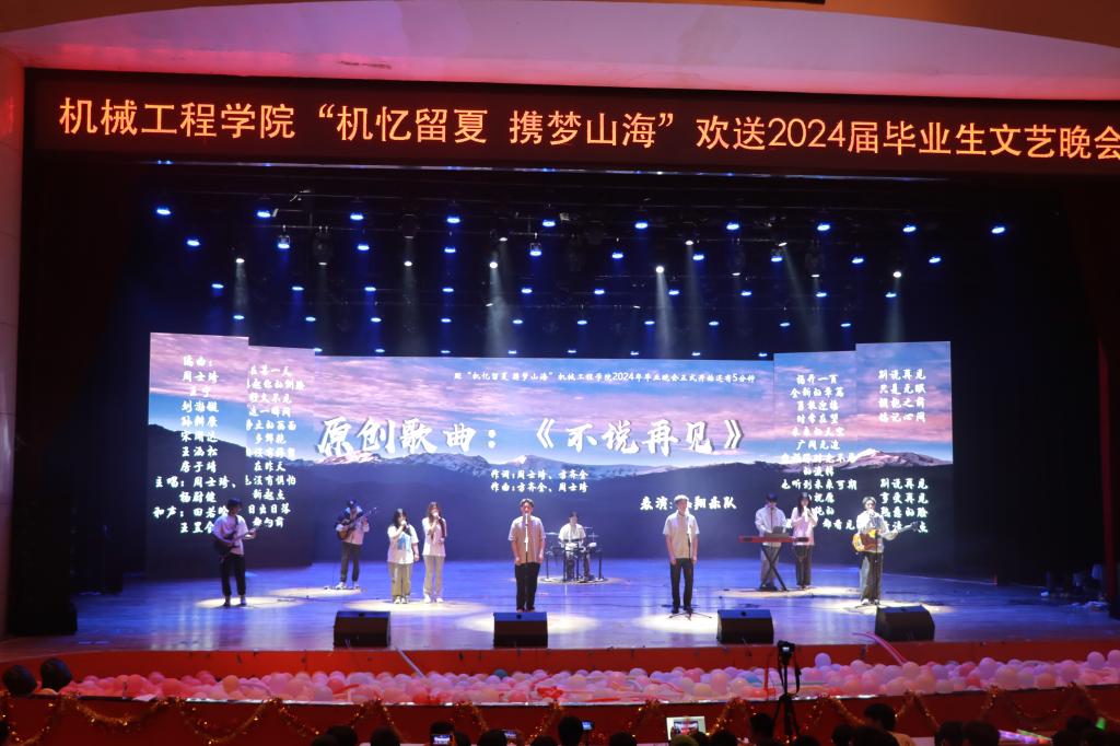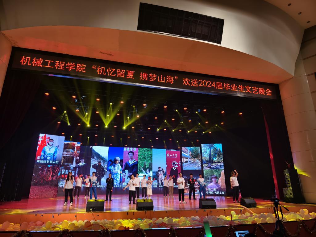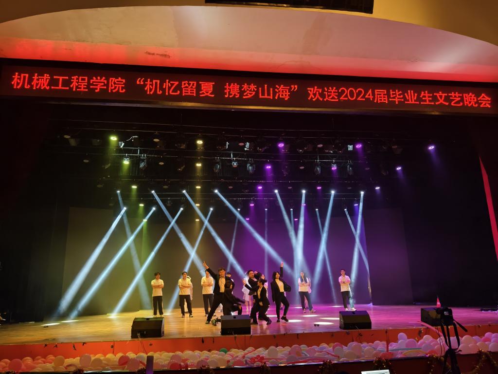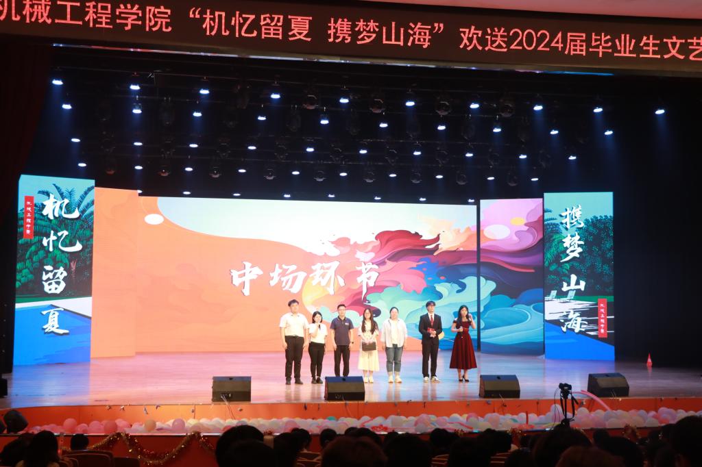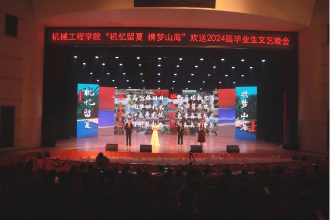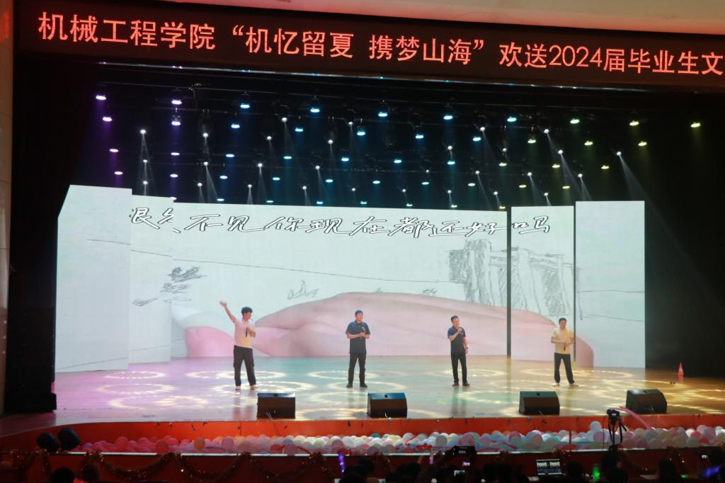 辅导员周士琦、海翔艺术团和1758社团带来舞蹈《You&Me》和原创歌曲《不说再见》,作为暖场节目点燃晚会现场气氛。伴随着大屏幕上的欢声笑语,同学们在燕园生活的点滴片段慢慢闪过,影片记录着同学们由懵懂走向成熟,由迷茫走向坚定的过程,也寄托着老师的殷殷嘱托。随着主持人登场报幕,2024届机械工程学院毕业晚会正式拉开序幕。武术《武悦华章》气势如虹,尽显少年英姿。男女齐舞《Waterfall》节奏感强,个性鲜明;由冬奥志愿者、研究生支教团成员、退伍毕业生等带来的合唱《我们都是追梦人》激人奋进,伴着间奏讲述的亲历故事让人动容,启示人们坚守燕大精神,心怀家国。由毕业生辅导员带来的舞蹈《护花使者》活泼可爱,赢得连连掌声;学院教师代表机制系郭保苏、机电系韩博、工学部叶妮佳、塑成系杜冰、图学部梁瑛娜、机设系黄世军和机控系张晋和冶金系任伟杰带来教师寄语《最后一课》,饱含着我院教师对全体毕业生的真挚祝福;师生合唱《有没有那么一首歌》感情真挚,令人共情,演唱者2024届毕业生赵千里亲手绘制属于大家的燕大记忆。