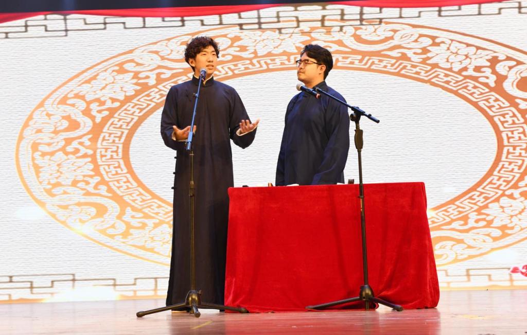 李宗伦和张晟宇带来的相声《五点钟开始》贴近毕业生在燕园的学习生活,现场引来笑声和掌声一片。