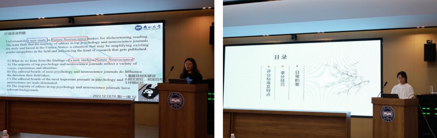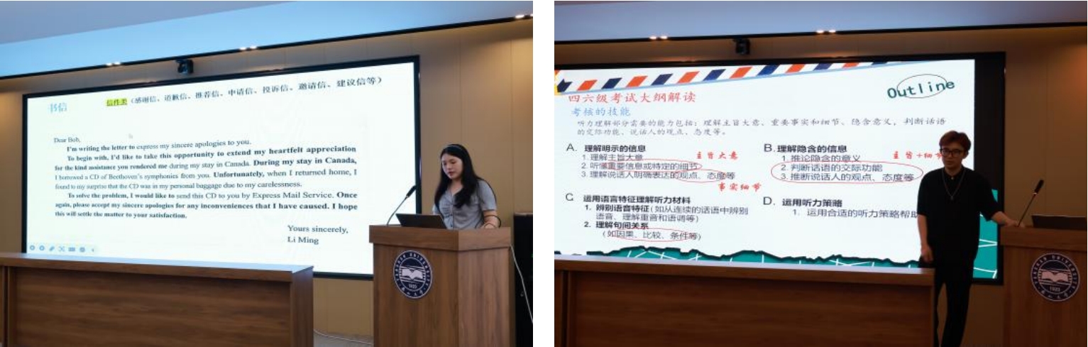 此次讲座讲解内容丰富,涵盖了英语四六级考试的写作、听力、阅读和翻译四个板块。讲解员们凭借深厚的英语功底和丰富的考试经验,深入浅出地解析了四六级考试的命题规律和评分标准,通过历年真题的具体实例,为同学们提供了切实可行的答题策略和技巧。在讲解过程中,四位讲解员还针对性地提出备考建议,强调了日常备考中多积累、多练习、熟悉题型及有效利用答题时间的重要性。讲解过程中,同学们积极参与互动,讲解员们耐心解答了同学们的疑问,提供了许多实用的备考建议。