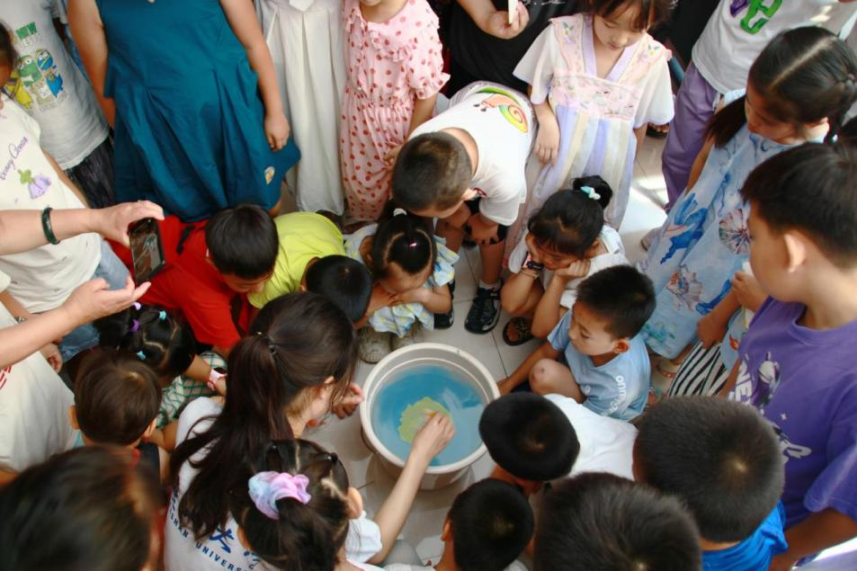 漆之世界,千文万华。实践团段晨曦将非遗漆扇带到自然家园社区课堂上,与大家一起讨论有关漆扇的历史文化,挑选自己喜欢的颜色滴入水中,将书签和团扇缓慢放入,开“盲盒”般的漂漆技艺让大家惊艳赞叹。