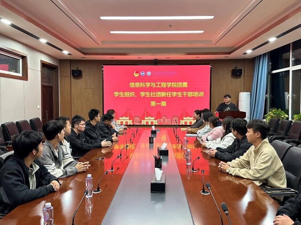 9月20日,信息科学与工程学院团委在信息馆1号楼英慧报告厅举办团属学生组织、学生社团新任学生干部第一期培训。培训由学院团委书记邹楠主讲,学院各团属学生组织、学生社团新任学生干部参加培训。