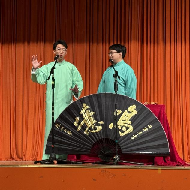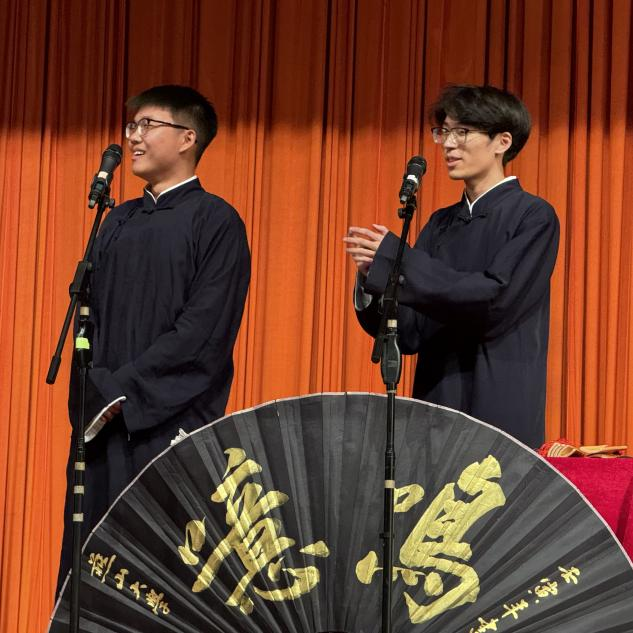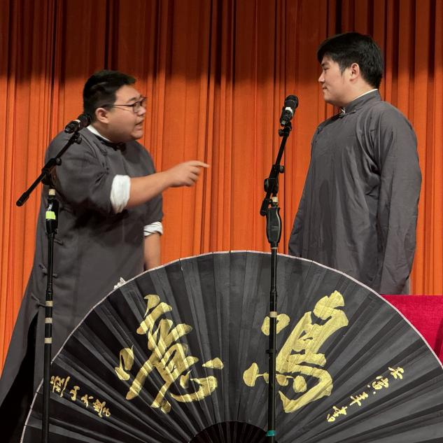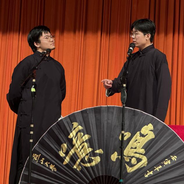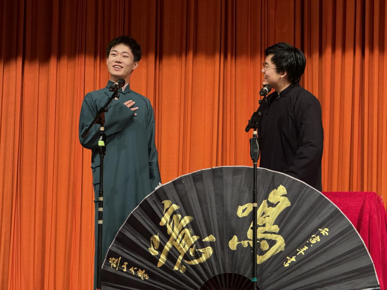 丁楷罡校友(左)和闫鹏(右)表演相声《黄鹤楼》