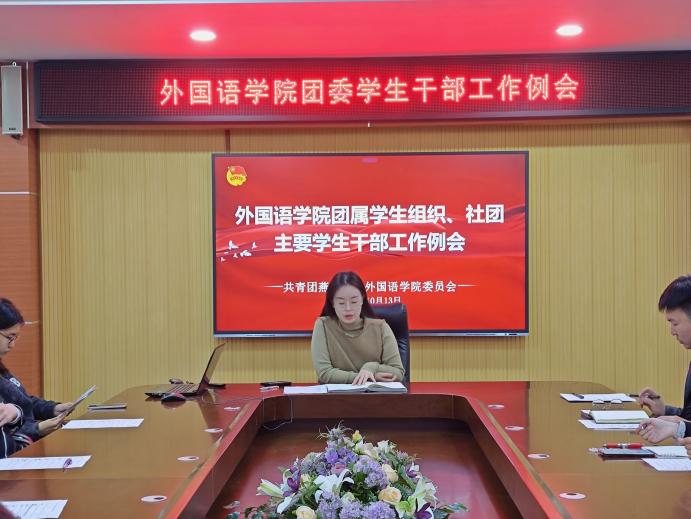 为进一步加强和规范我院团学组织管理,调动学生干部在新学期的工作热情,充分发挥学生干部在学生中的带头服务作用,推动团学组织健康有序发展。外国语学院于10月13日在人文馆417会议室召开团属学生组织、社团主要学生干部工作例会。本次会议旨在回顾上学期的工作成果,规划本学期的工作重点,并动员全体学生干部以饱满的热情投入到新学期的学习和工作中。会议由院团委书记宋冉主持,团委副书记许美慧、谢雅宣、胡佳亮,以及学院团学组织、社团的全部主席团参会。