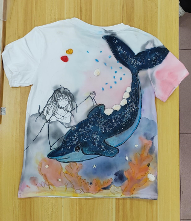 作品选择贝壳和塑料碎片作为装饰,创造性的彰显了年轻人保护海洋的主题。同时选取小女孩和海豚为绘画主体,生动形象表达了年轻人对于海洋保护的责任担当意识;正面选择颜色晕染和写字装饰,强调了绘画主旨:海洋与我们息息相关,青年人自有责任担当。