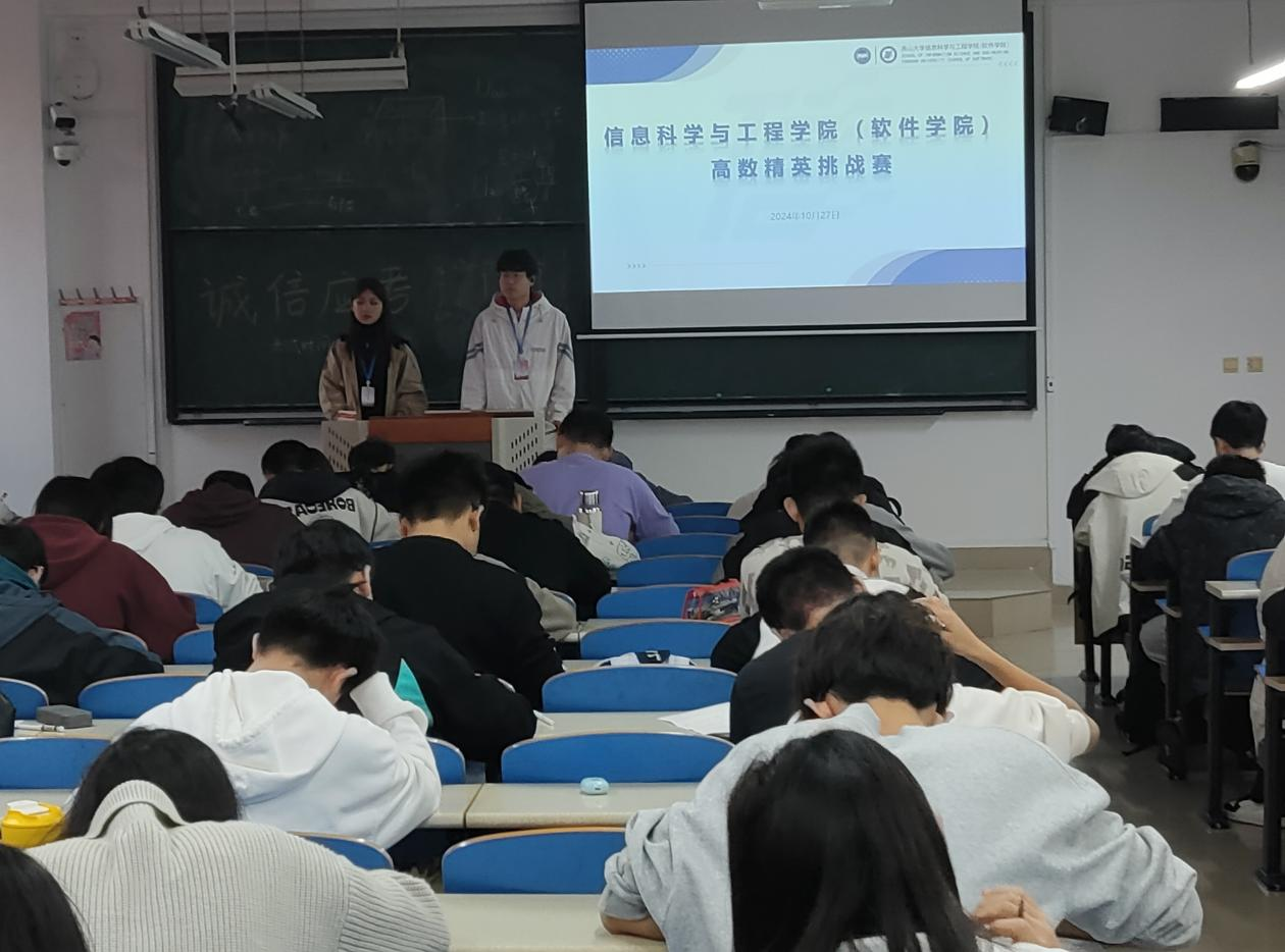 10月27日,信息科学与工程学院举办2024年“高数精英挑战赛”暨高数期中模拟考试。本次竞赛由信息科学与工程学院团委、“寓见诚信”一站式学生社区主办,学生会、信远学业发展中心、学霸讲师团联合承办,2024级本科生全员参加竞赛。