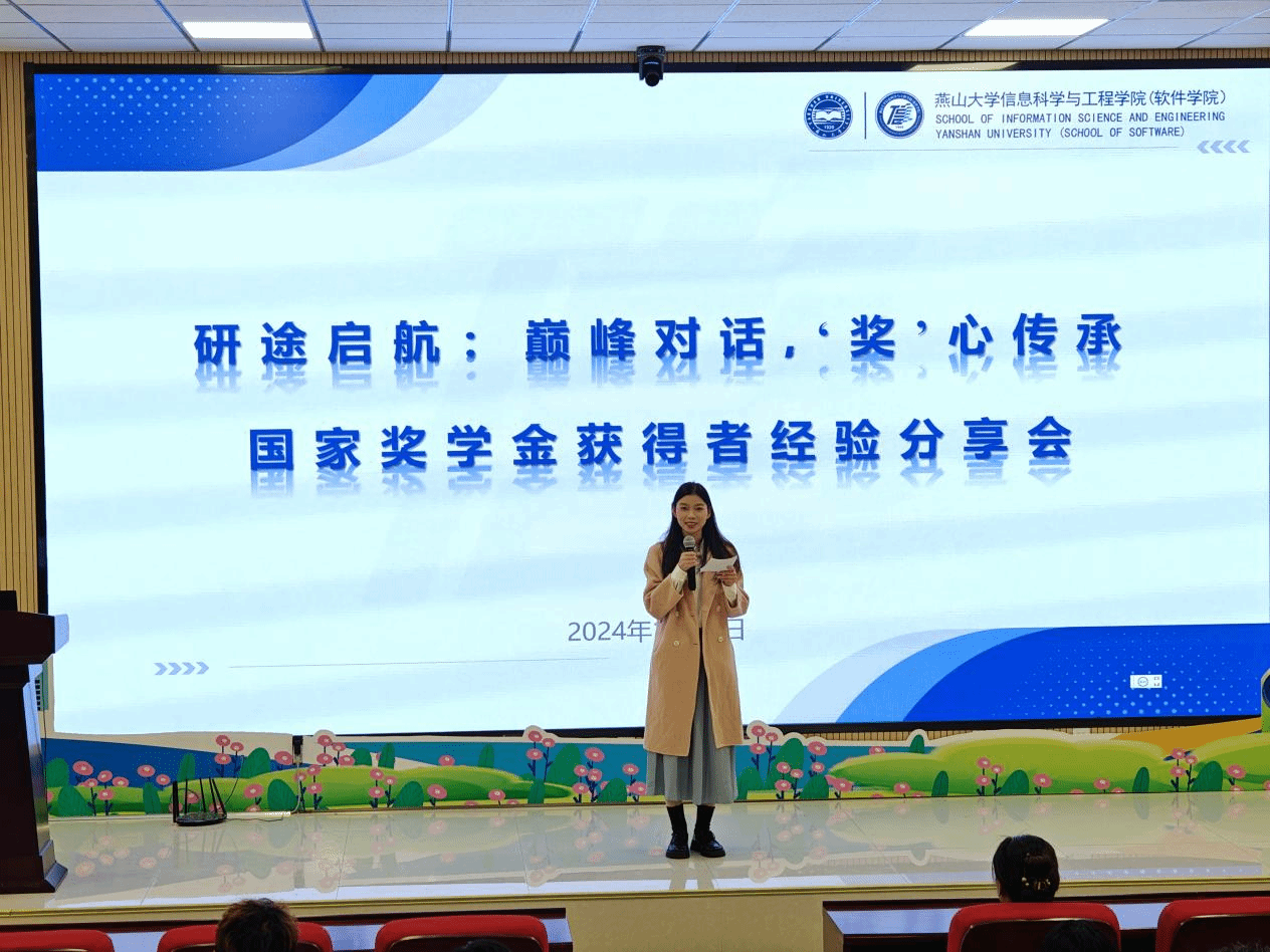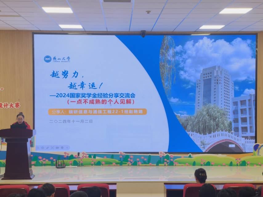 赋能成长,追求卓越。11月3日,信息科学与工程学院研途启航系列活动之“巅峰对话,‘奖’心传承”研究生国家奖学金获得者分享会在信息馆2号楼行知学术报告厅举办。分享会由信息学院团委主办,学院研究生会承办,2022级信息与通信工程专业赵艳娟、计算机科学与技术专业于泽鹏及电子科学与技术专业武瑞三位研究生国家奖学金获得者担任分享嘉宾,学院240余名研究生新生参与分享会,研究生会学术部申梦颖同学担任分享会主持人。