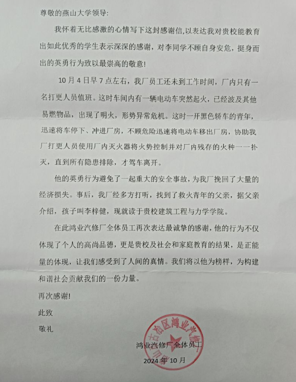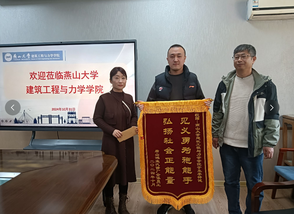 2024年10月31日,建筑工程与力学学院迎来了一批特殊的客人,他们手持“见义勇为施能手 弘扬社会正能量”的锦旗和感谢信,来寻找那个危急关头扑灭火情、避免唐山鸿业汽修厂遭受巨大财产损失的见义勇为好青年——我院2022级土木工程专业学位硕士研究生学生李梓健。一面锦旗、一封感谢信,道出了一个暖心的故事。