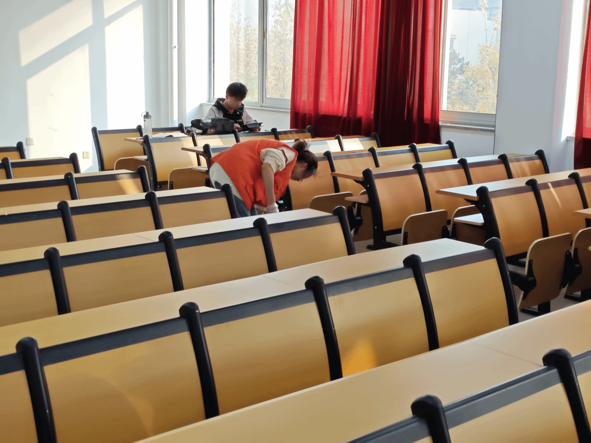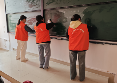 在“教室焕新”环节,志愿者们手持清洁工具,走进西校区第三教学楼,把对校园深沉的热爱与关怀、为师生们营造温馨舒适学习环境的坚定信念与不懈追求,融入清扫地面垃圾、擦拭桌椅黑板的活动中。志愿者们的身影在教室中交织,构成了一幅动人的劳动图景。