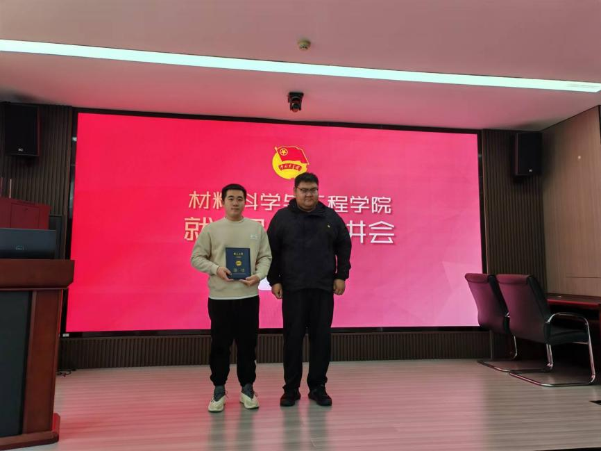 宣讲会现场气氛热烈,同学们纷纷就职业规划、求职技巧等方面的问题进行提问,薛昱迪耐心细致地为同学们答疑解惑,并鼓励大家要勇敢追求自己的梦想,不断挑战自我、超越自我。宣讲会结束后,材料科学与工程学院团委书记魏东向薛昱迪颁发了“大学生就业引航员”聘书。