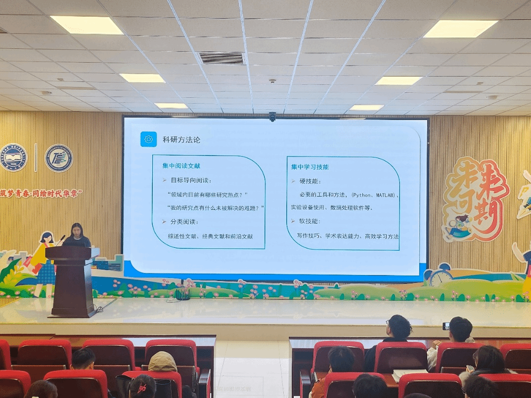 王雨萌从科研方法论、时间管理、论文写作心得和实验设计经验等四个部分进行了分享。她建议:同学们要学会集中阅读文献(目标导向阅读和分类阅读),注重集中学习技能(硬技能和软技能),掌握必要的学习工具和方法,熟练使用实验设备和数据处理软件,灵活运用论文写作技巧,注重提升学术表达能力和学习效率。
