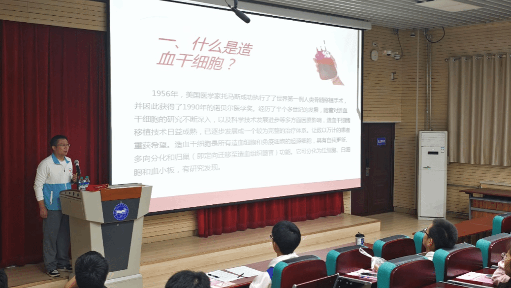 活动开始,陈志刚向同学们介绍了造血干细胞及各种相关疾病。随后,他又介绍了捐献造血干细胞的九步流程并列举数据,并讲述了自己捐献造血干细胞的亲身经历和其他志愿者参与捐献的故事,使同学们深刻体会到造血干细胞配型成功的困难。在互动交流环节,同学们积极提问,陈志刚耐心进行解答。为了感谢学生的积极参与,他还特别准备了纪念品作为奖励。整个活动现场气氛热烈,充分展现了大家对造血干细胞知识的浓厚兴趣和对志愿者精神的崇高敬意。