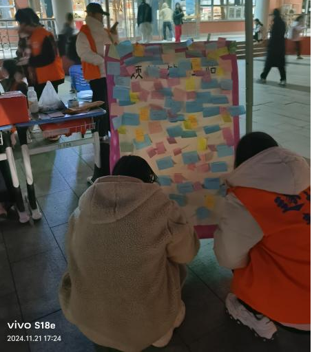 为加大活动反响,有效缓解同学们的焦虑,志愿者们准备了糖果,折纸等小礼品。在志愿者们的鼓励下,同学们在烦恼处理站上贴上了自己的烦心事,从鼓励箱中抽取了别人的暖心鼓励话语的纸条,也为下一位同学写下暖心的祝福语。这样的爱心接力,让笑容在同学们的脸上绽放。仅一上午,烦恼处理站上已经留满了同学们心灵的痕迹。活动持续一整天,活动最后,志愿者们打扫干净场地卫生,有序离场。