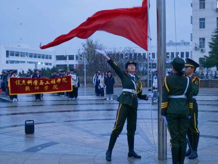 11月25日清晨,在蒙蒙细雨中,信息科学与工程学院在西校区西(二)教学楼广场举行“笃行励志,强国有我”升国旗仪式暨主题党日活动。活动由信息科学与工程学院团委主办,爱燕大辅导员工作室、校国旗护卫队、学院研究生会、学生会联合承办,学院团委书记邹楠,辅导员刘许瑞、孟宪源、李萌,2024级全体新生及学院全体学生党员参加。
