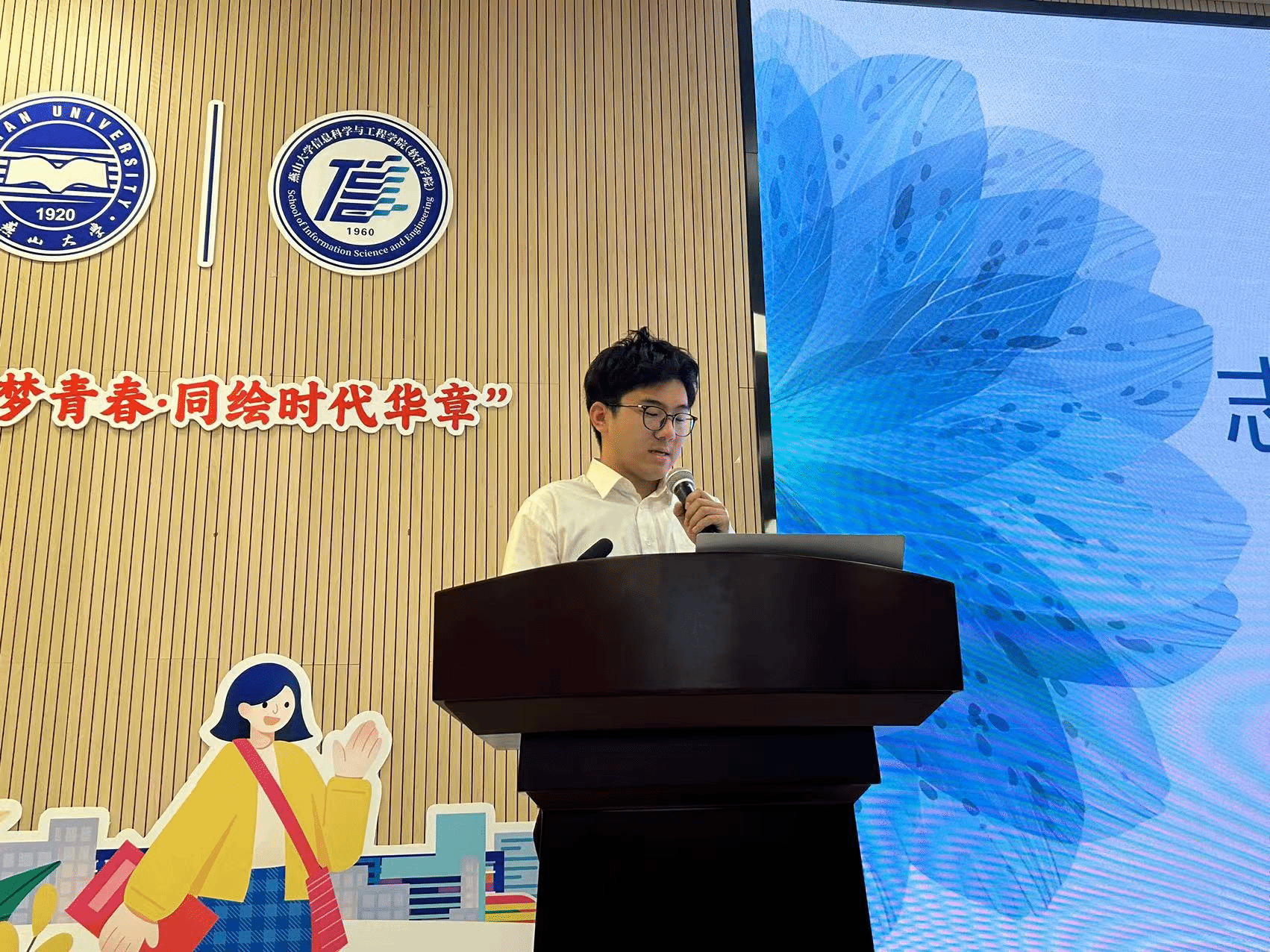 本次培训,邀请信息学院的七名优秀学生代表进行事迹宣讲。他们是:本科生国家奖学金获得者代飞达、优秀学生干部代表赵凇玮、志愿之星获得者彭洋、就业典型齐叶琛、退役军人水雅敬、研究生支教团张明昊、无线电爱好者协会(河北省活力社团TOP100)袁辉。他们结合自己的成长经历,分享了在校期间的感悟与收获,展现了燕大青年敢于吃苦、敢于拼搏、逐梦青春的精神风貌。
