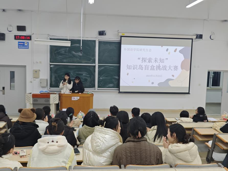 为了不断探索新颖、有趣的学习方式来激发学生的学习热情和求知欲,外国语学院研究生会于11月23日下午三点在东校区第四教学楼208教室举办了一场知识竞赛——“探索未知”知识岛盲盒挑战大赛。赛事内容横跨英语、日语、德语与法语,以其独特的盲盒形式,吸引了无数热爱知识的学子们踊跃参与,展现了燕大学子深厚的专业底蕴和浓厚的学术追求。