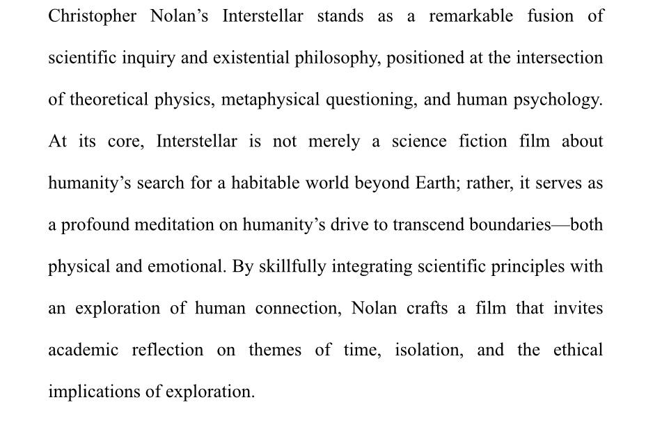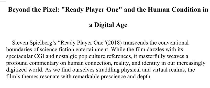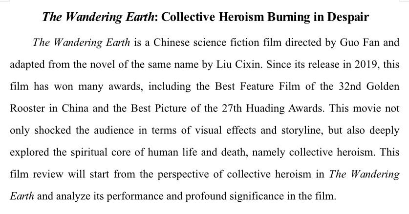 在活动中,同学们深入思考,撰写外语影评,表达个人见解与创新思考,展现出对科技电影独到的理解与感悟。他们通过不同文化背景下的科技观念碰撞,不断成长,进而增强了探讨社会热点问题的语言应用和表达能力。获奖的同学们凭借深刻的见解、流畅的语言表达以及对电影独特的剖析视角,在众多参赛者中脱颖而出。以下为优秀作品展示: