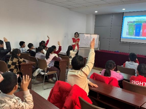宣讲队员通过PPT讲解、视频科普、课堂问答互动、分组随堂小测的方式生动形象地开展了此次宣讲。孩子们跟随宣讲队员依次学习了生活中常见的垃圾、垃圾不及时处理带来的危害、如何进行垃圾分类以及减少垃圾产生的小妙招。